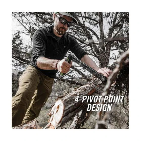 Portable. Safe. Functional. The Gerber Freescape Folding Camp Saw features an innovative design that allows the saw to fold up flat while remaining completely assembled and without threat of lost parts. It utilises four pivot points to effectively cut larger diameter wood while using the full length of the blade. When folded up, the blade is protected and can be stowed safely in a gear kit or camp bin. Its bright green accents along the black rubber surface make it easy to spot in the shuffle of camp gear. The grippy rubber Freescape textured handle stays firmly in the hand no matter the conditions. Replace the saw’s standard 30cm blade easily if required.