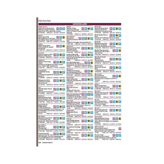 A numbered caravan symbol has been placed on the map at each town or location where a park can be found and each state has an index of parks at the beginning of the listing that can be used as a quick reference. Travellers can also use the informative symbols in the book to determine whether a park meets their needs.