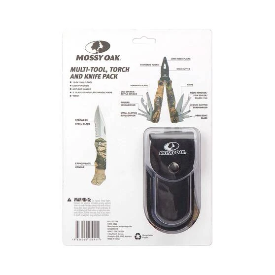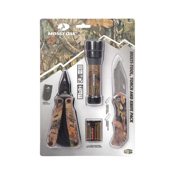 Have all your handiest tools on hand with the Mossy Oak Multi-Tool Torch and Knife 3 Piece Pack. Consisting of a 15-in-1 Multi-Tool, 3.5” folding blade pocket knife and aluminium torch all with included batteries for the torch and a handy pouch for your multi-tool, this pack makes a fantastic gift for the outdoor dad!