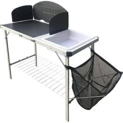 Create the perfect camping or glamping set up with the Wanderer Premium Camp Kitchen! The all-in-one solution to your camp kitchen woes. Designed with a quick and easy to assemble X shape frame, you’ll be ready to cook up a storm in no time. The two hanging storage cupboards are handy spots for your utensils, condiments and dry food supplies, whilst the aluminium slat top with wind shield helps to keep your fire burning. A foldable basin is included for easy wash up after dinner, with the whole camp kitchen folding up into a handy carry bag when you’re ready to head home.